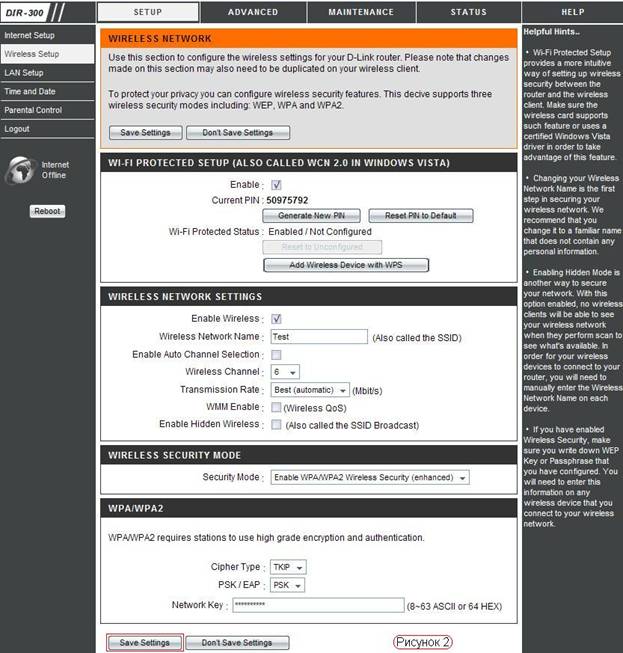 В разделе «WI-FI PROTECTED SETUP» c пункта Enable галочку лучше снять, поскольку не все беспроводные адаптеры поддерживают  технологию Wi-Fi  Protected Setup.