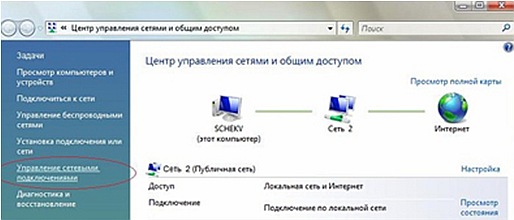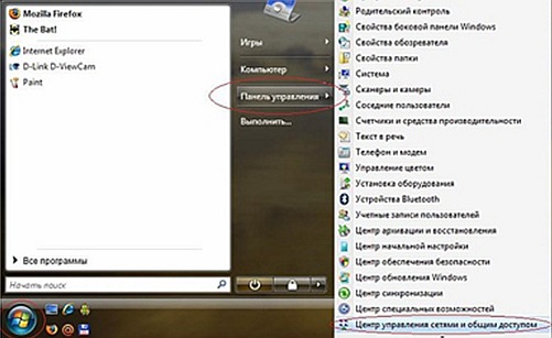 Зайдите в меню «Пуск->Панель управления->Центр управления сетями и общим доступом»