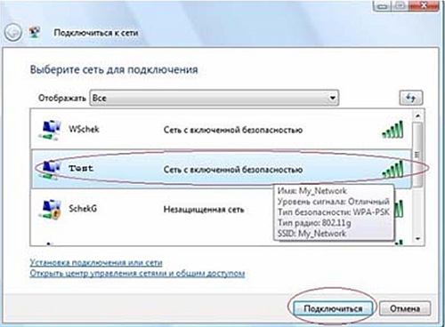 В перечне обнаруженных беспроводных сетей найдите и выделите имя сети «Test», затем нажмите кнопку «Подключить» внизу окна.