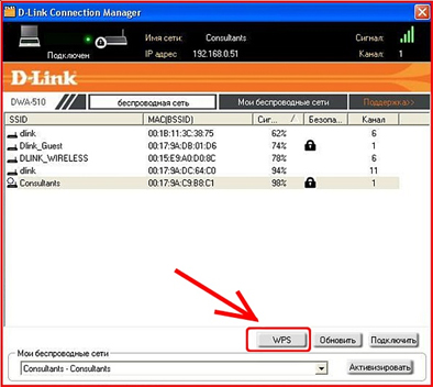 - Откройте список доступных беспроводных сетей. Если адаптер поддерживает функцию WPS, то нет необходимости выбирать нужную сеть, просто нажмите кнопку WPS: