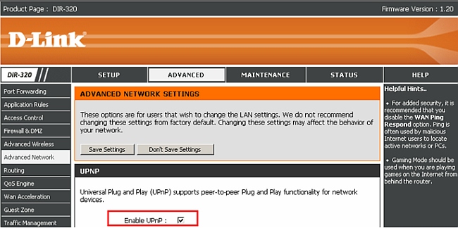 2. Зайдите в меню: Advanced > Advanced Network.  Поставьте галочку в пункте «Enable UPnP».