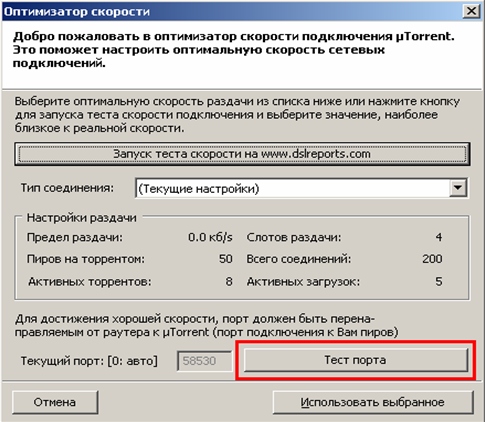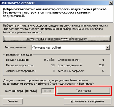 4. Запустите программу и проверьте, открыт ли порт, через который будет работать uTorrent:Настройки > Оптимизатор скорости > Тест порта