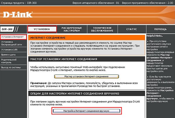 В меню «Установка > Установка Интернет» нажмите на кнопку «Настройка Интернет-соединения вручную».