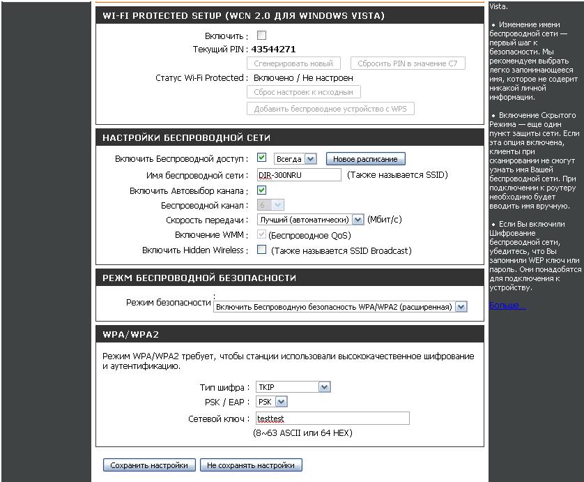 В разделе «WI-FI PROTECTED SETUP» c пункта Enable галочку лучше снять, поскольку не все беспроводные адаптеры поддерживают технологию Wi-Fi Protected Setup."