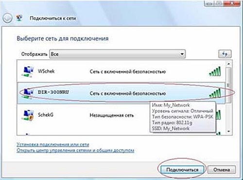 В перечне обнаруженных беспроводных сетей найдите и выделите имя сети «DIR-300NRU», затем нажмите кнопку «Подключить» внизу окна.