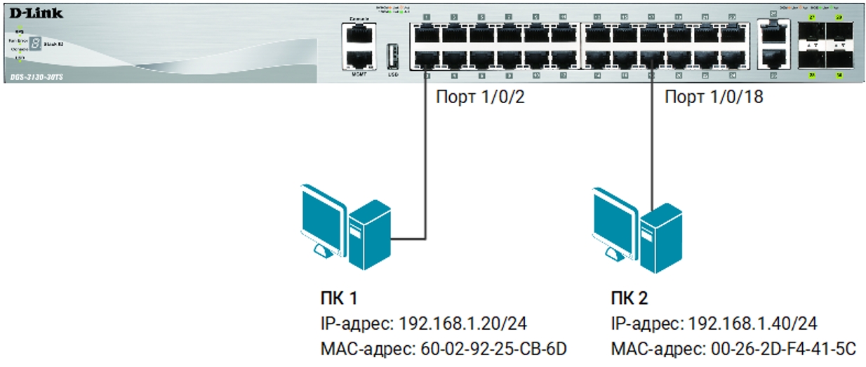 1. Создайте записи IP Source Guard для компьютеров ПК1 и ПК2: