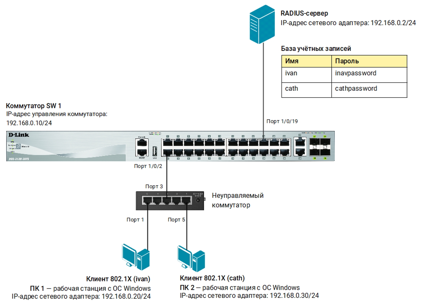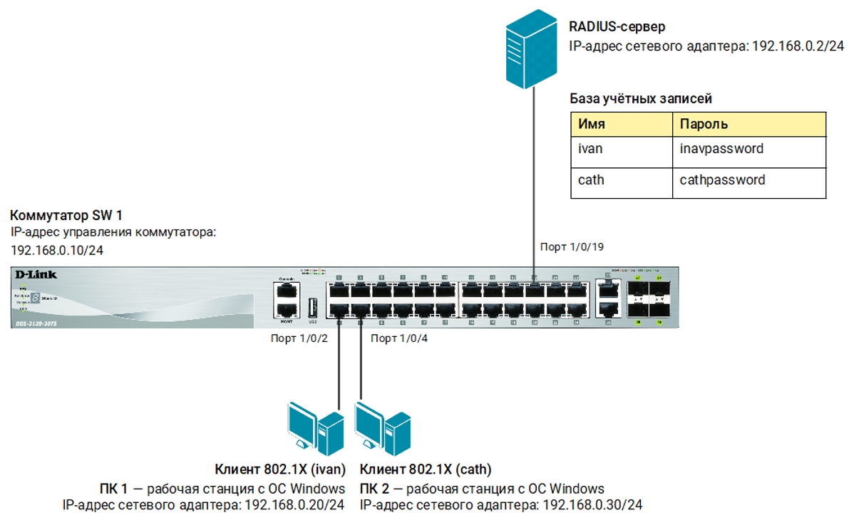 Кроме коммутатора, нужно настроить RADIUS-сервер и 802.1X-клиент на рабочей станции. В качестве RADIUS-сервера может использоваться различное ПО, например, freeradius для OC Linux.