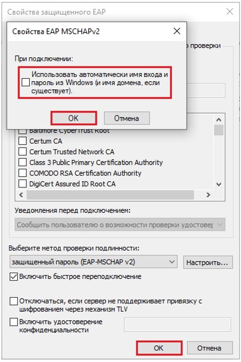 - В открывшемся окне снимите галочку Использовать автоматически имя и пароль из Windows и нажмите кнопку ОК. В окне Свойства защищенного EAP нажмите кнопку ОК.