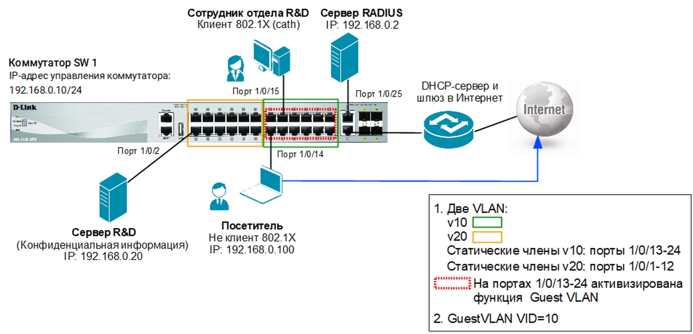 Задача решается настройкой 802.1X Guest VLAN на коммутаторе. Неаутентифицированным пользователям, находящимся в VLAN 10, разрешен доступ в Интернет. После успешной аутентификации пользователей, порты к которым они подключены, будут добавлены в VLAN 20.