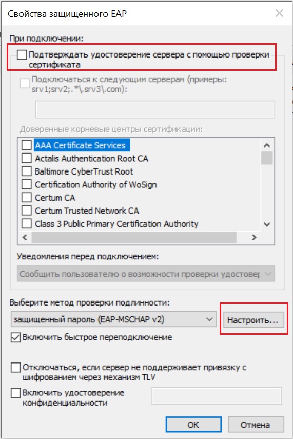 - В открывшемся окне снимите галочку Подтверждать удостоверение сервера с помощью проверки сертификата и нажмите кнопку Настроить.