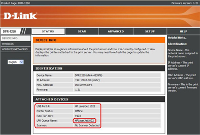 Вследствие вышеупомянутой специфики протокола и функциональных возможностей нашего принт-сервера, DPR-1260 обнаружит GDI принтеры (HP 1020/1022), но в статусе отобразит состояние Offline.