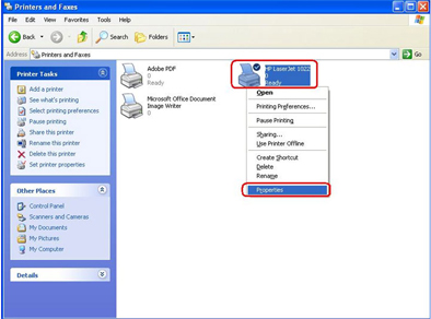 В операционной системе откройте "Printers and Faxes" . На установленном принтере кликните правой кнопкой мышки, и выберите из появившегося меню "Properties".