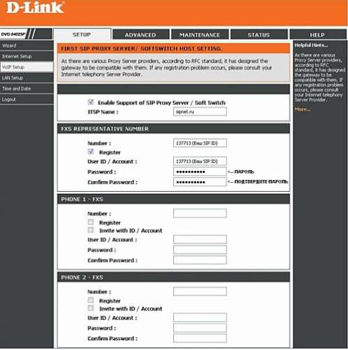 Вопрос: Настройка VoIP - маршрутизаторов D-Link DVG-5402SP и DVG-G5402SP для работы в сети SIPNet