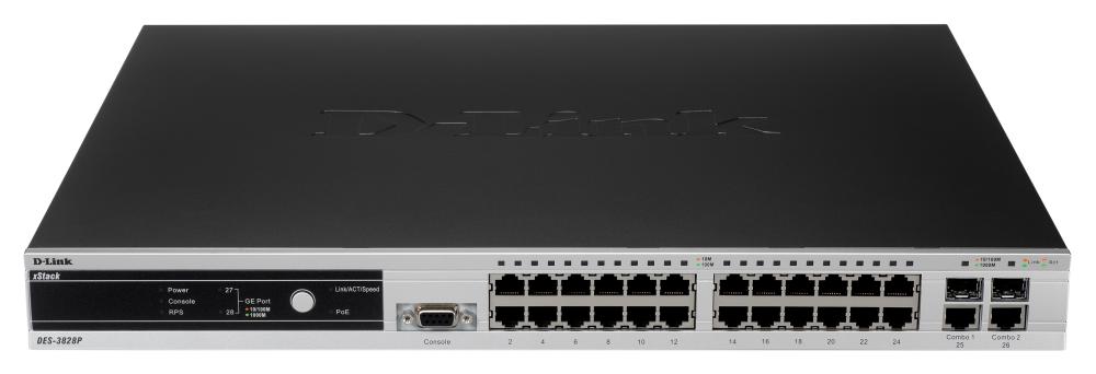 DES-3828P Управляемый коммутатор 3 уровня с 24 портами 10/100Base-TX с поддержкой PoE, 2 портами 10/100/1000Base-T и 2 комбо-портами 100/1000Base-T/SFP