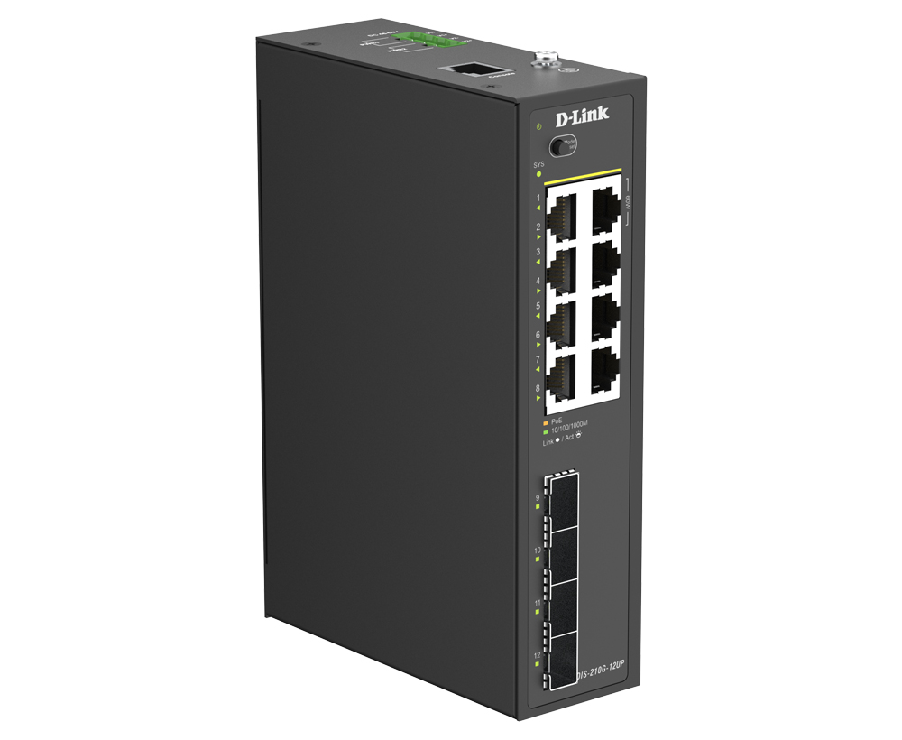 Промышленный управляемый L2 коммутатор DIS-210G-12UP, оснащенный 8 портами 10/100/1000Base-T с поддержкой PoE, а также 4 портами 1000Base-X SFP, которые используются для организации подключения к высокоскоростной магистрали, предназначен для применения в сетях промышленных предприятий. DIS-210G-12UP поддерживает расширенные функции управления и безопасности. Функции управления включают SNMP, управление на основе Web-интерфейса и интерфейс командной строки (CLI).