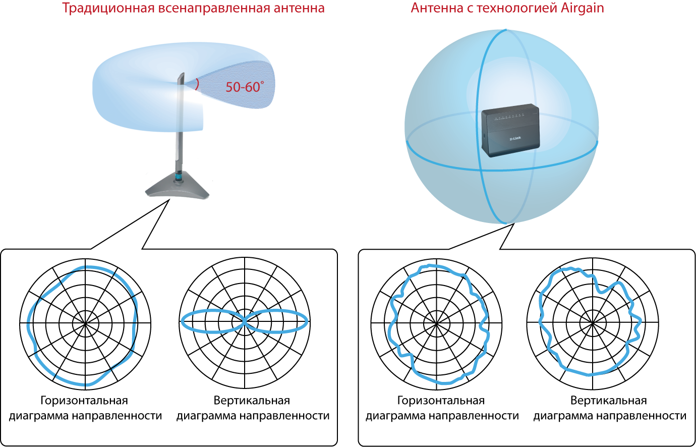 Маршрутизатор оснащен встроенными всенаправленными антеннами Airgain. Несмотря на свои компактные размеры, такие антенны не только не уступают по характеристикам традиционным штыревым, но и во многом превосходят их. Обладая высоким коэффициентом усиления (4 dBi для диапазона 2,4 ГГц и 6 dBi для диапазона 5 ГГц) и круговой диаграммой направленности в горизонтальной и вертикальной плоскостях, антенны Airgain одинаково хорошо работают в любом направлении, обеспечивают расширенную зону покрытия беспроводной сети и снижают вероятность возникновения «мертвых» зон.